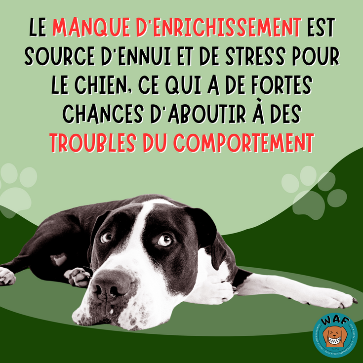 Le manque d’enrichissement peut être source d’ennui, d’anxiété et de stress chez un chien, aboutissant souvent à des problèmes comportementaux. Le manque d’activité physique (et la malbouffe, mais j’ai déjà écrit sur ce sujet) est l’une des principales causes d’obésité chez le chien.